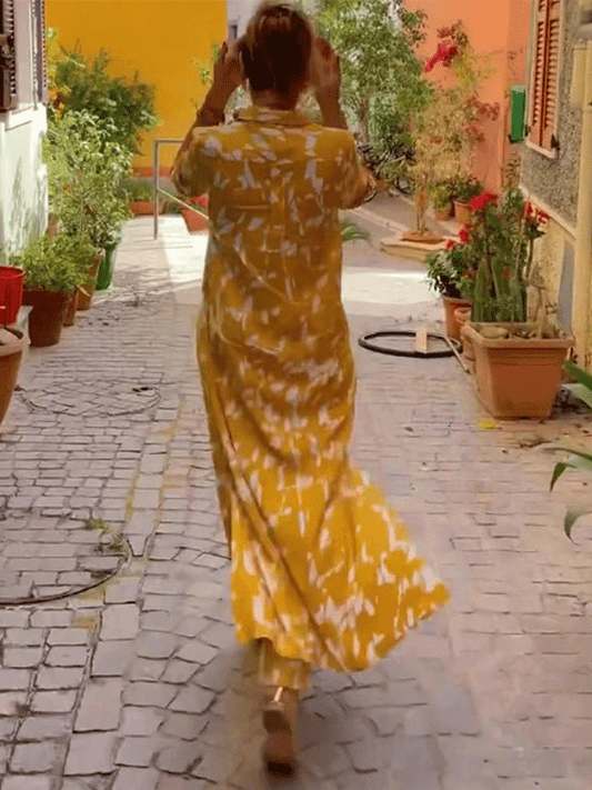 V-Neck Long Sleeved Pocket Printed Long Dress